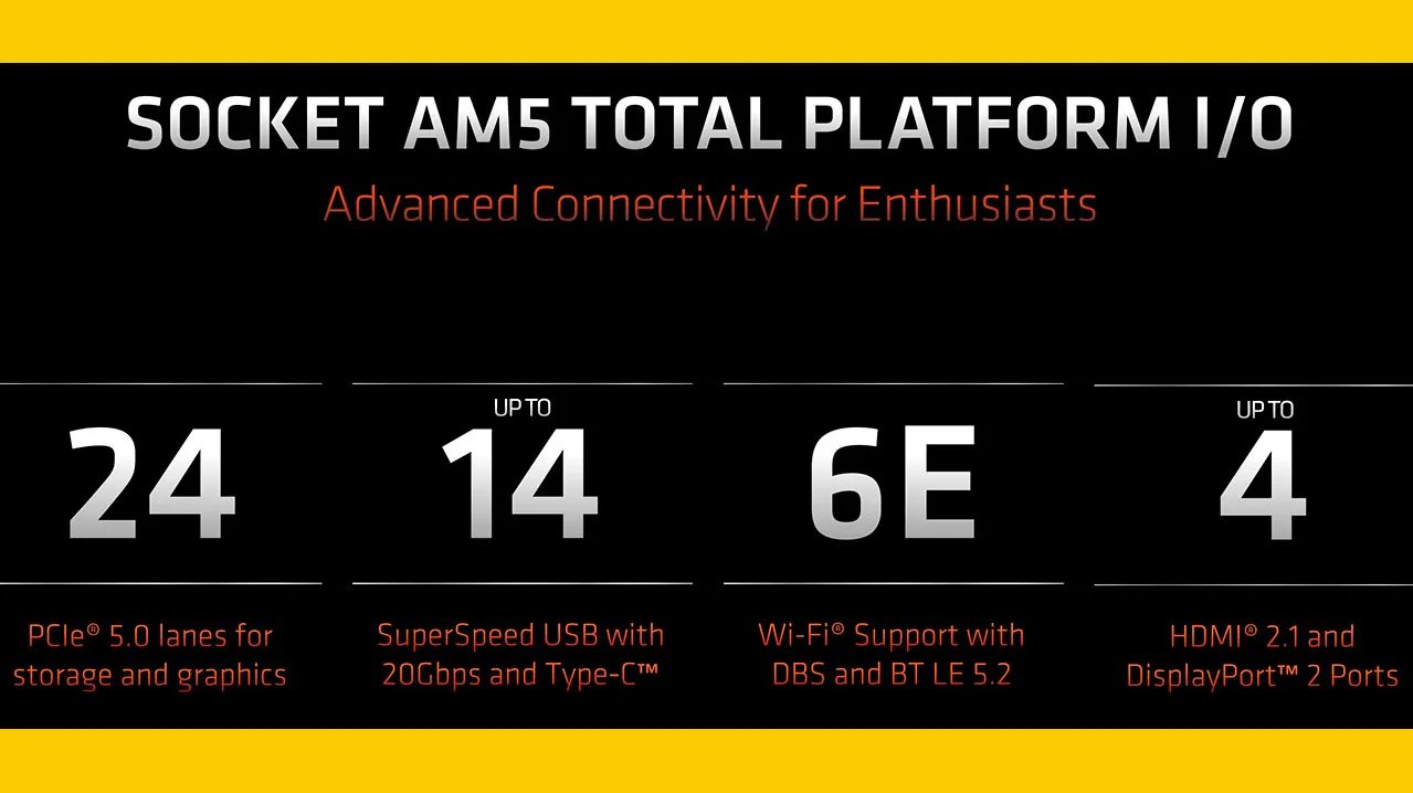 I/O aynı zamanda yeni AM5 platformu için bir dizi bağlantı seçeneği sağlayacak. AMD’nin ilk nesil Ryzen ile piyasaya sürülen AM4 platformunu emekliye ayırdığını bir süredir biliyorduk, Ryzen 7000 ile AM5 ilk defa gözler önüne seriliyor. AM5 anakartlar, tümü I/O kalıbı tarafından etkinleştirilen 24 adet PCIe 5.0 hattını, 20 Gbps hıza sahip 14 adede kadar USB bağlantı noktasını ve dört bağımsız ekran çıkışını (HDMI 2.1 veya DisplayPort 2) destekliyor.