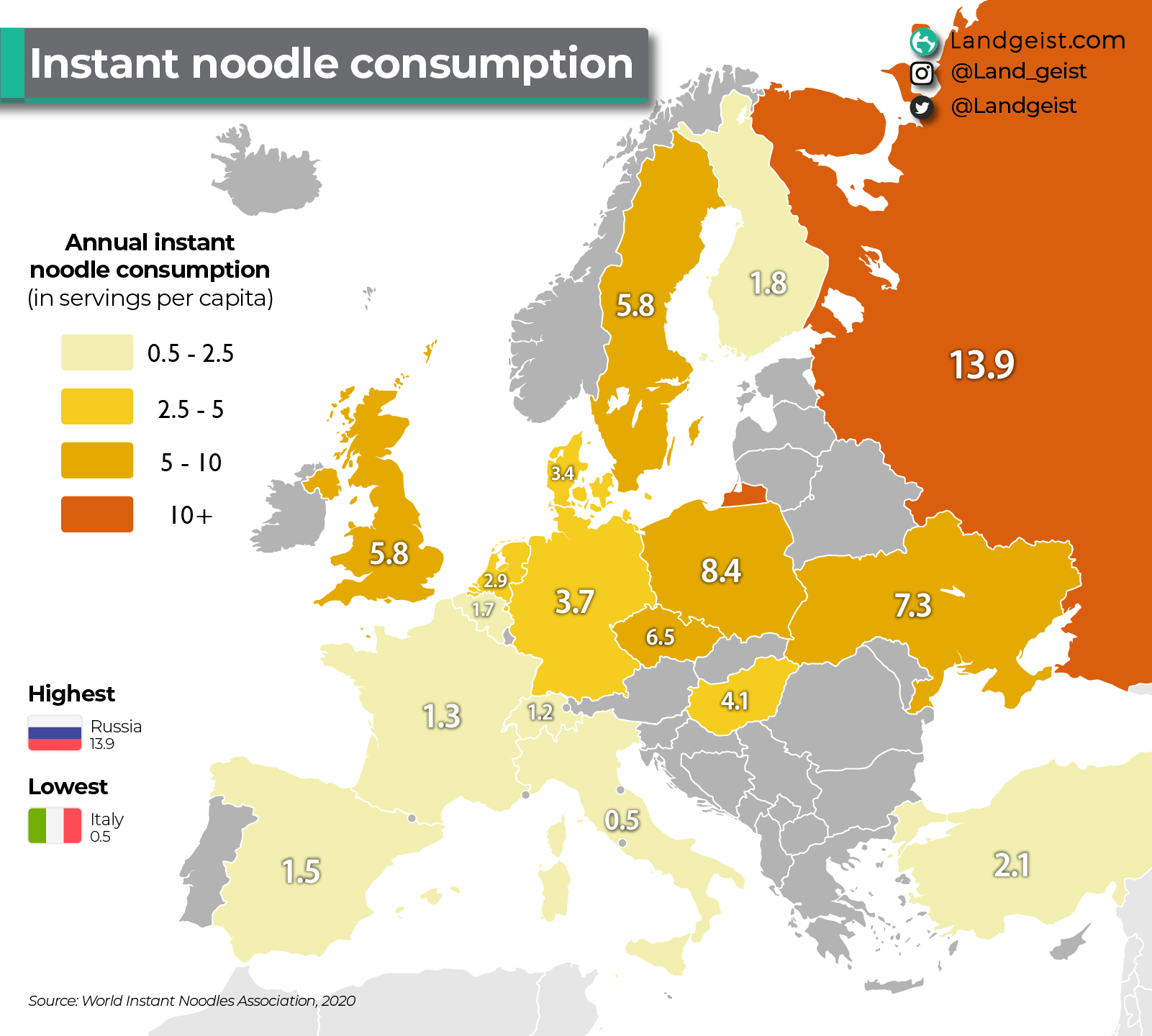 Hiçbir yerde Asya'daki kadar popüler olmasa da, Avrupa'nın bazı ülkelerinde oldukça fazla tercih edilen yiyeceklerden.Landgeist'in World Instant Noodles Association (Dünya...