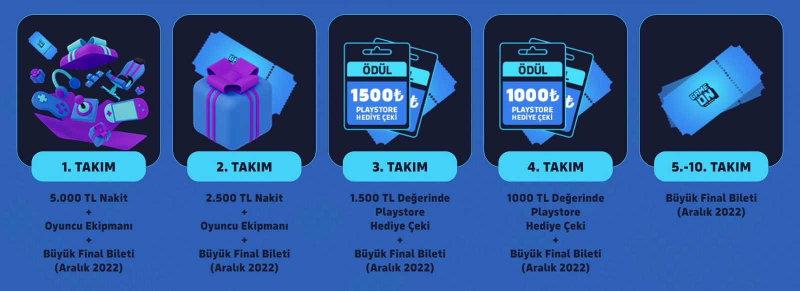 GameOn turnuvasında ilk 10'a girmeyi başaran takımların ödülleri ise şu şekilde;