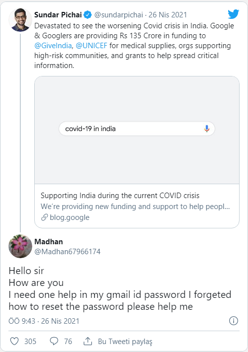Şifrelerimizi çoğu zaman unutabiliyoruz be böyle bir durumda müşteri hizmetleri ile iletişime geçme dahil birçok farklı seçenek bulunuyor ancak zaman zaman farklı yollardan ilerlemek isteyenler de oluyor. Örneğin, Hintli bir kullanıcı Gmail hesabına ulaşamayınca, Google CEO’su ile iletişime geçti ve olay internette viral oldu.Geçen hafta Google CEO’su Sundar Pichai, Covid-19 ile mücadele kapsamında Hindistan’a yardım edeceğini açıklayan bir Tweet atmıştı. Pichai paylaşımında, Google ekibinin tıbbi malzemelere ulaşmayı kolaylaştırmak, kuruluşlara yardım etmek ve kritik bilgilerin yayılmasını desteklemek için çalışma başlattıklarını bildiren mesaj yayınladı ve kısa sürede birçok sevgi dolu mesaj aldı. Bu mesajların arasında ise ilginç bir istek söz konusuydu.