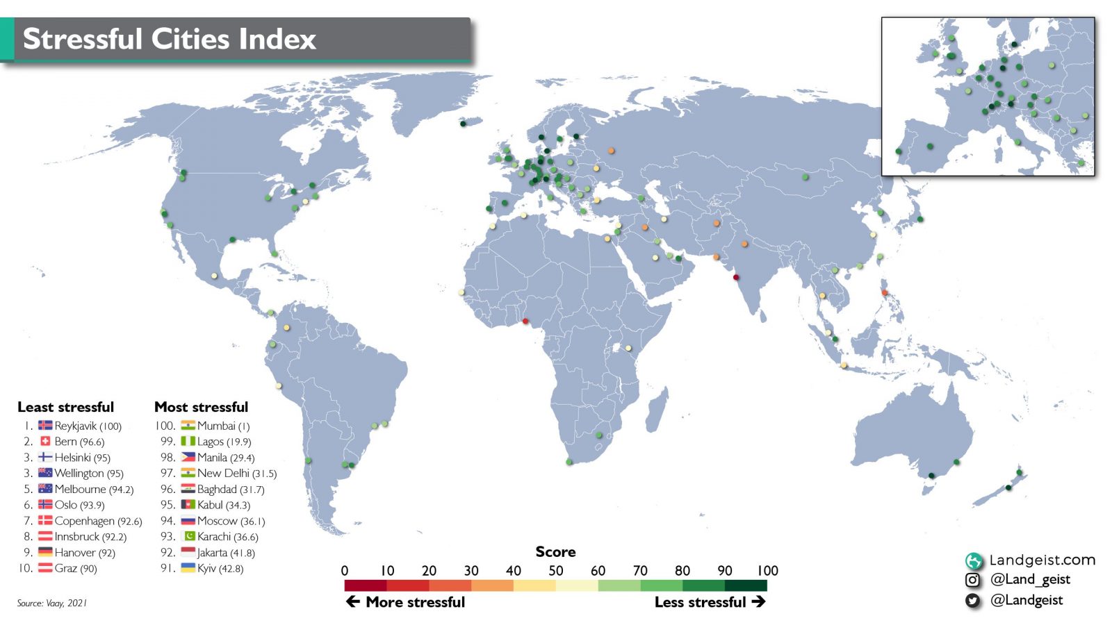 Bir şehirde, metropolde yaşamak başlı başına bir stres sebebi olabilir. İnsan kalabalığı, gürültü kirliliği, trafik sıkışıklığı insanın stres seviyesini artıran şeyler. Ayrıca büyük şehirlerde yaşayabilmek için genelde daha yüksek maliyetler karşınıza çıkar bu da daha yoğun bir çalışma hayatı gerektirir. Tabii ki bunlar tüm şehirler için aynı değil.Landgeist'in hazırladığı en stresli ve en az stresli şehirler haritasına baktığımızda bazı şehirlerde yaşamak diğerlerine göre daha az stresli olabiliyor.Bu haritada, içinde yaşamanın ne kadar stresli olduğuna göre derecelendirilen ve sıralanan 100 büyük şehri görebiliyoruz. Sıralama, Vaay tarafından derlenen Stresli Şehirler Endeksi'nden geliyor. Bu endekste 100 şehir aşağıdaki göstergelere göre derecelendirildi:Yönetim: