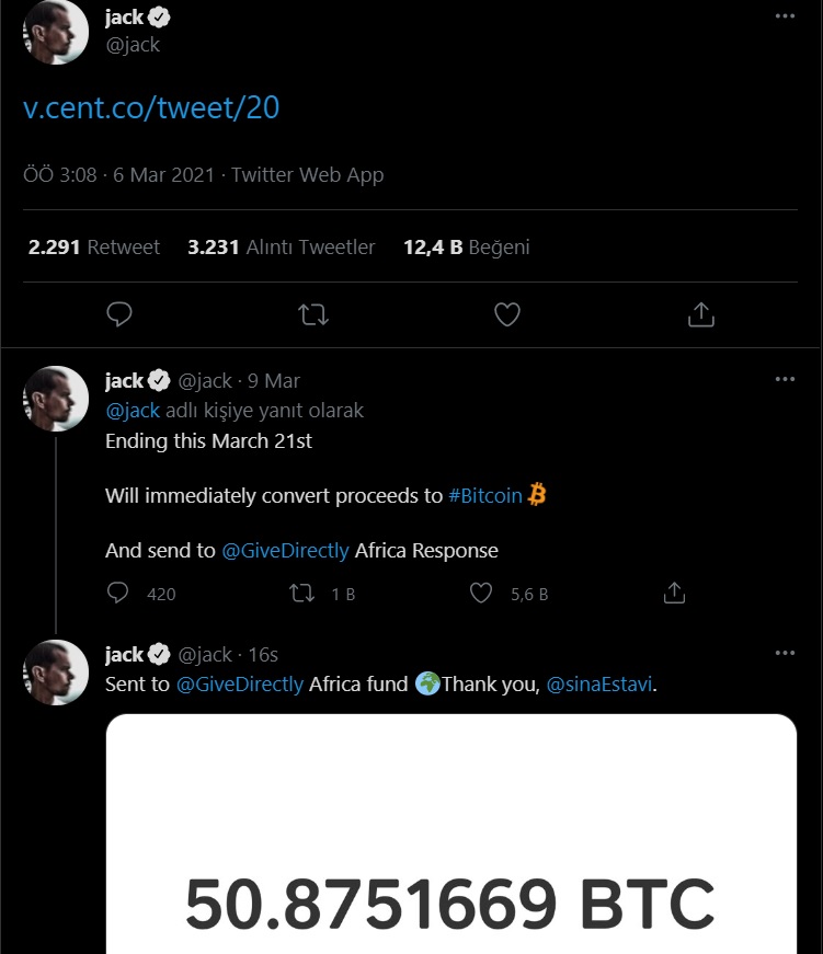 Bridge Oracle'ın CEO'su Sina Estavi, dünyanın ilk Tweet'ini aldı. Hatırlayacağınız gibi, Dorsey bu ayın başlarında ilk Tweetini Valuables'ta açık artırmada satacağını duyurmuştu.Bu haberin açıklanmasının ardından CEO birçok teklif aldı ve uygun teklifi kabul ettikten sonra geliri “Directly Africa Response fund“a bağışladı. Dorsey pazartesi günü, koronavirüs salgınından etkilenen insanlara yardım etmek için örgüte 50 bitcoin bağışladığını doğruladı.