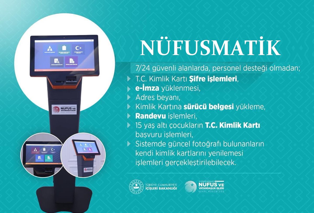 Nüfusmatik"ler 81 ilde 105 noktada hizmet vermeye başladı.İçişleri Bakanlığından yapılan yazılı açıklamaya göre, bakanlık mühendislerince tamamen yerli ve milli yazılım ile geliştirilen, 10 Ocak'ta 50 ildeki nüfus müdürlüklerinde hizmet vermeye başlayan nüfusmatikler ülke geneline yaygınlaştırıldı, 81 ilde 105 noktada hizmet vermeye başladı.Nüfusmatiklerden bir ayda 10 bini aşkın kişi işlem gerçekleştirdi.