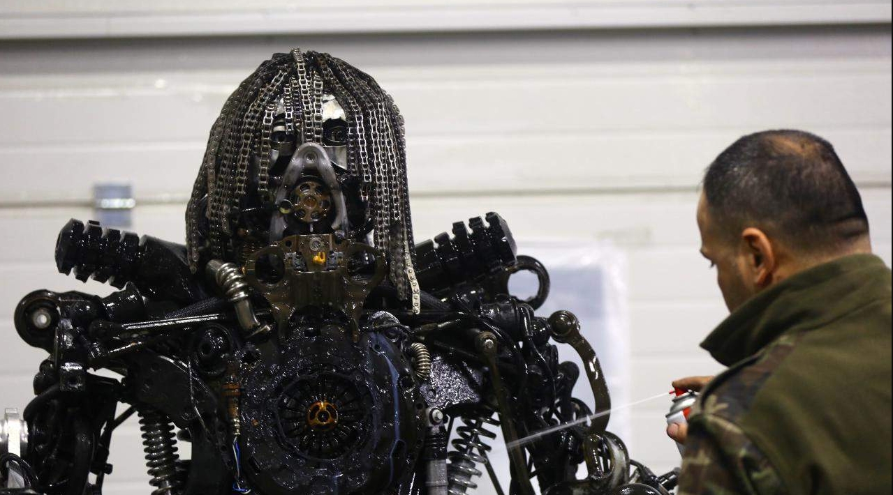 buji, cıvata, kayış, zincir, amortisör, motor kapağı ve mekanik parçaları biriktirerek küçük motosiklet, tank, asker, baykuş, fotoğraf makinesi gibi metal figürler haline getirmiş.