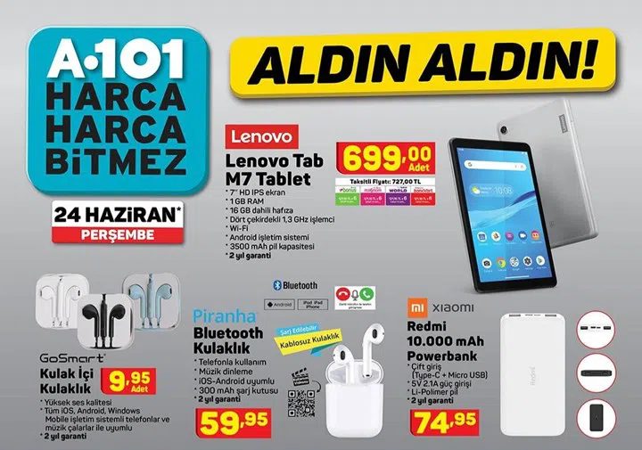 A101 marketlere, 24 Haziran tarihinde birçok teknolojik ürün gelecek. Lenovo Tab M7 tablet modeli var. Bu tablet kullanıcılarına; 7 inçlik HD ekran 4 adet Cortex -A7 çekirdekli MediaTek işlemci ve Android 9 Go işletim sistemi mevcut. Bunlara ek olarak ise 2 MP ön ve arka kamera, 3500 mAh kapasiteli batarya sunan Lenovo Tab M7 tablet 699 TL fiyatıyla kullanıcı bekliyor olacak.