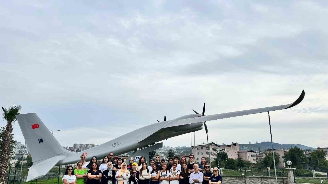 İtalya, Litvanya ve Yunanistan’dan Samsun’a gelen öğrenci ve öğretmenler, Canik Özdemir Bayraktar Keşif Kampüsü’nü gezdi, Akıncı TİHA önünde poz verdi.