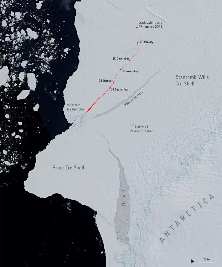 Avrupa Uzay Ajansı (AUA), Büyük Londra büyüklüğünde bir buzdağının kırılmasının muhtemel olduğunu hesaplamıştı. AUA geçen hafta yaptığı açıklamada, "Neredeyse iki yıl sonra, buzdağında çatlamalar başladı, ancak mevcut veriler büyük kırılmanın yaklaştığını gösteriyor, " dedi. "Copernicus Sentinel misyonları tarafından yakalanan görüntülerde görülen yeni bir çatlak, şimdi birden fazla buzdağının parçalanma potansiyelini gösteriyor."
