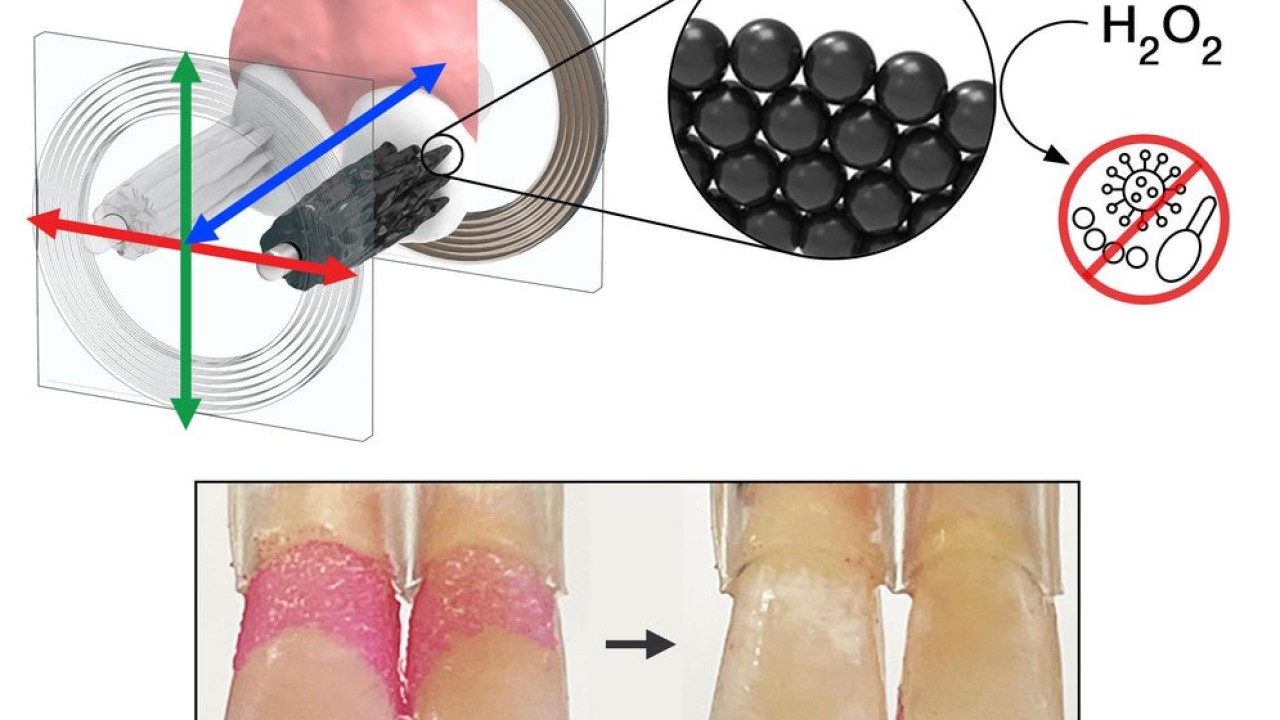 Bu mikrorobotlar, katalitik ve manyetik özelliklere sahip demir oksit nanoparçacıklarından oluşur. Her iki durumda da nanopartiküller, zararlı oral bakterileri ortadan kaldıran antimikrobiyalleri serbest bırakmak için katalitik bir reaksiyonla diş yüzeyine yönlendirilir.
