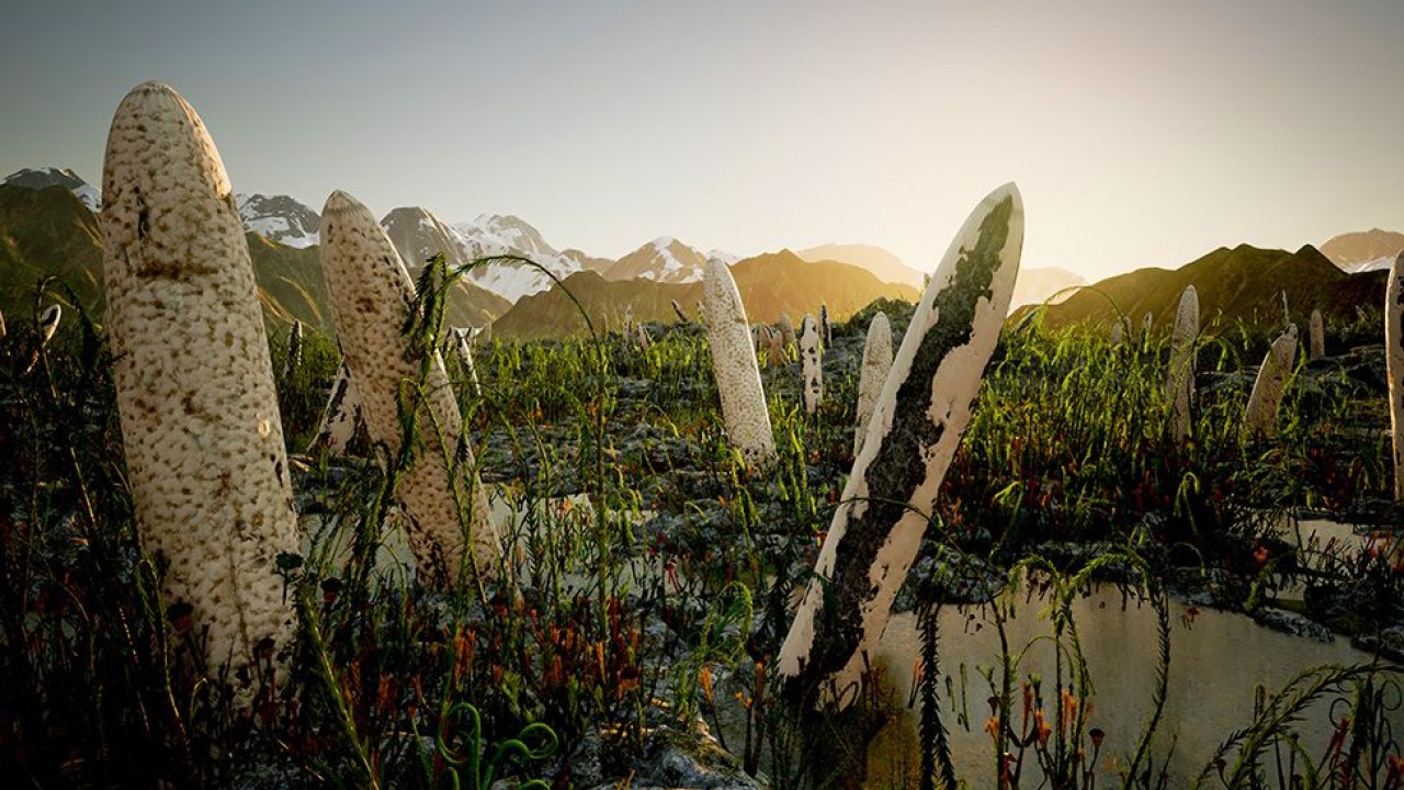 "O zamanlar odunsu bitkiler yoktu; bitki örtüsünün çoğu çok küçüktü. Ancak, manzarayı gölgede bırakan bir dev bulunuyordu. Prototaxites adında çok esrarengiz bir fosil...
