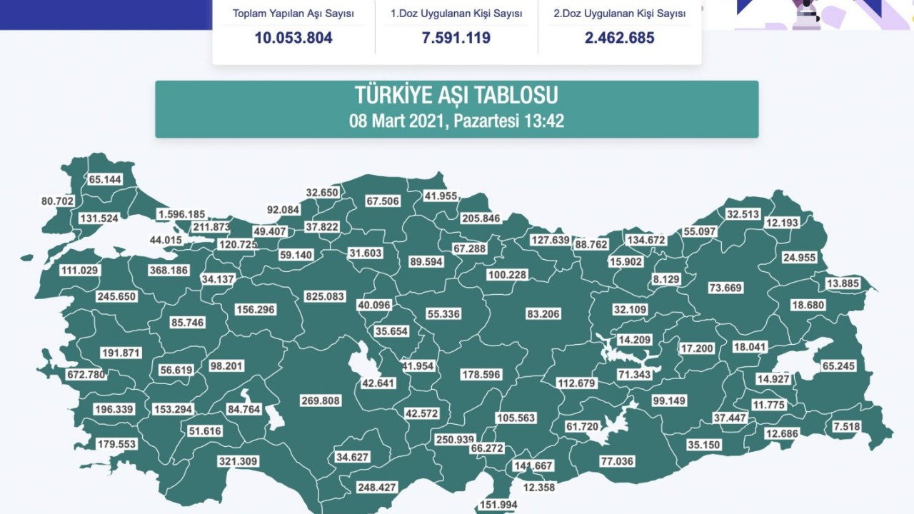 Sağlık Bakanlığı’nın resmi internet sitesine bakıldığında, yapılan toplam COVID-19 aşı sayısının 10 milyonu geçtiği görülüyor. 1. doz aşı olan kişi sayısı 7, 5 milyonun üzerinde, 2. doz COVID-19 aşısı olan kişi sayısı ise 2, 5 milyona yaklaşıyor.