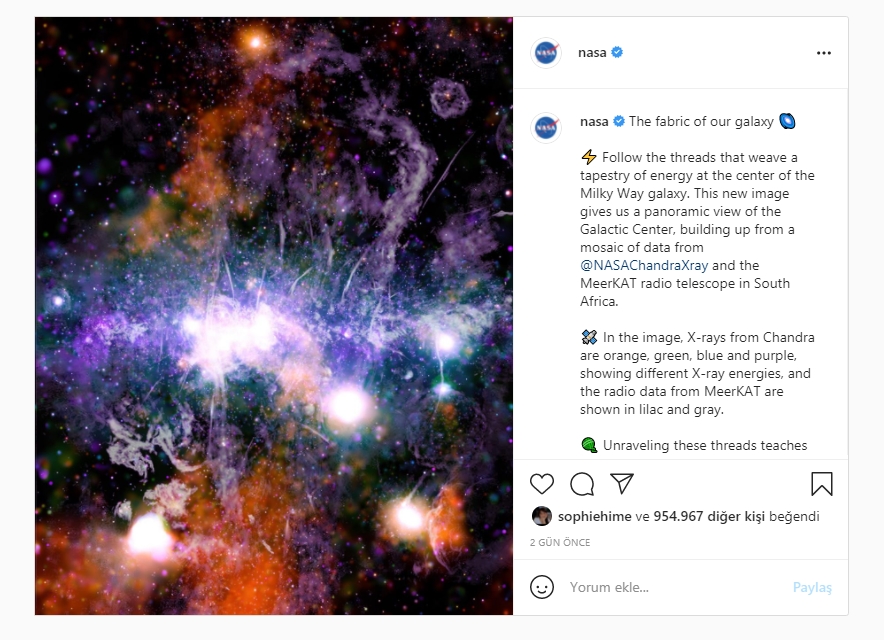 ABD Uzay ve Havacılık Ajansı (NASA), Güney Afrika’da bulunan Chandra X Işını Gözlemevi ve MeerKAT radyo teleskopu tarafından 20 yıllık bir süreçte yaptığı 370 gözlem sonucunda Samanyolu’nun aşırı ısınmış gaz iplikleri ve manyetik alanlardan oluşan merkezinin görselini yayınladı.
