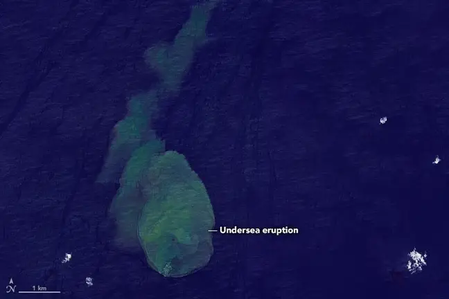 "14 Mayıs 2022'de Landsat 9'da Operasyonel Land Imager-2 (OLI-2) tarafından elde edilen görüntüler denizaltı yanardağından yayılan rengi bozulmuş suyu gösterdi.
