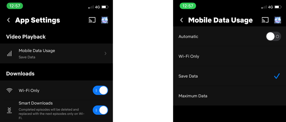 Dışarıdayken Netflix izlemeyi seviyorsanız, mobil veri planınızı oldukça kolay bir şekilde yiyebilir . Netflix'in veri tasarrufu modu yardımcı olabilir. Netflix uygulamasında Profil > Uygulama Ayarları > Mobil Veri Kullanımı seçeneğine gidin . Burada “ Otomatik ” özelliğini devre dışı bırakın ve “ Veri Tasarrufu ” seçeneğine geçin .