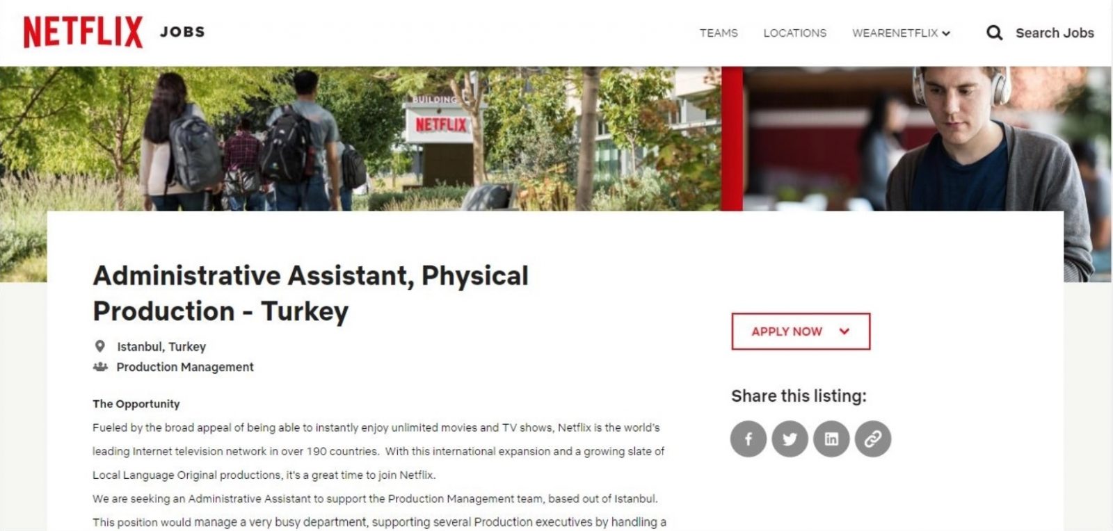 Netflix geçtiğimiz günlerde Türkiye'nin ilk ofis lokasyonunu İstanbul'da açacağını duyurmuştu. Şirket, açıklamanın ardından bir iş ilanı daha yayınladı. Geçtiğimiz günlerde duyurulan iş ilanı, Post Prodüksiyon Koordinatörü ve Fiziksel Üretim Koordinatörü pozisyonlarındaydı. Ancak bu sefer Netflix, İstanbul ofisi için bir İdari Asistan arıyor.