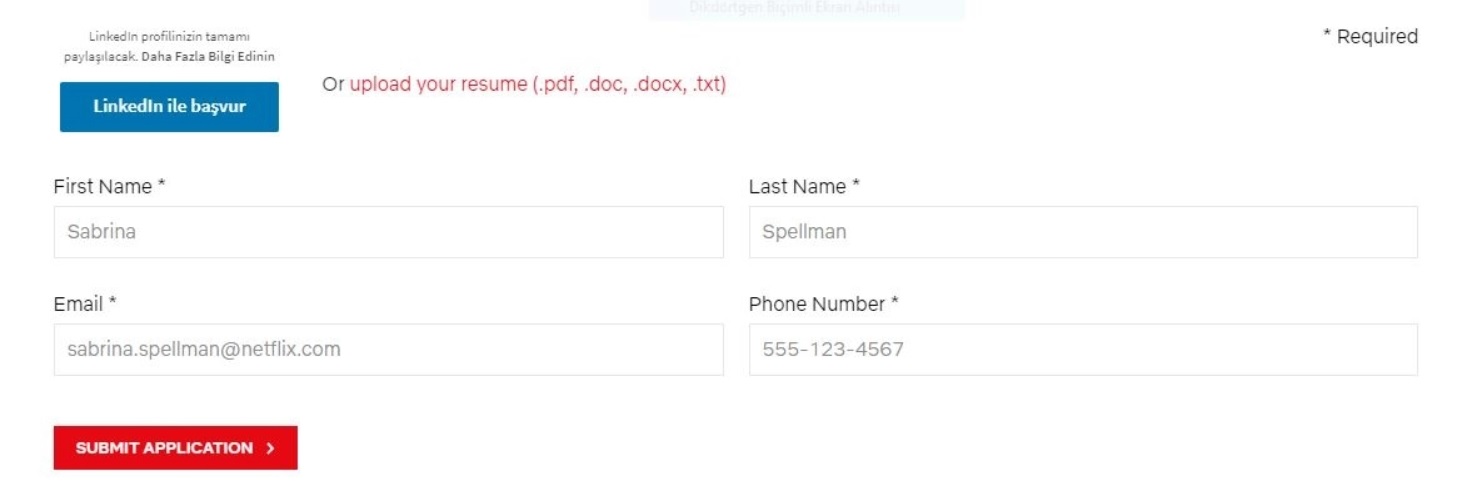 web sitesi veya LinkedIn üzerinden.İsterseniz doğrudan başvuru bilgilerini doldurabilir ve özgeçmişinizi Netflix tarafından hazırlanan sayfaya yükleyebilirsiniz veya aynı sayfadaki "LinkedIn'e Başvur" düğmesini tıklayarak Netflix başvurusu yapmak için LinkedIn hesabınızı kullanabilirsiniz.