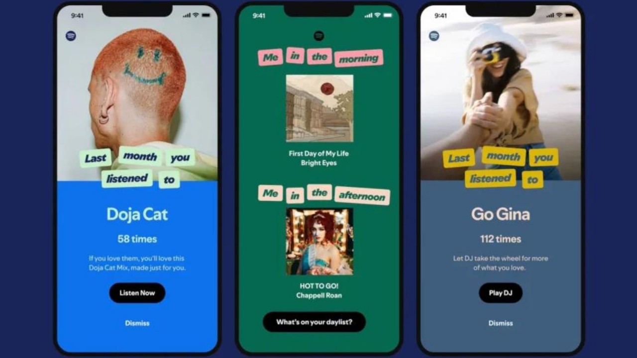 Örnek olarak, son bir ayda Doja Cat'in şarkılarını 58 kez dinleyen bir kullanıcı, Doja Cat miksine yönlendiren bir afiş görebilecek. Bir başka örnekte ise, kullanıcının favori parçalarından "Go Gina"nın DJ miksine yönlendiren bir mesaj gösterildi. "Benim Spotify" afişleri ve mesajları, aynı zamanda kullanıcıların kişiselleştirilmiş çalma listeleri, podcast'ler ve öneriler bulabilecekleri "Sana Özel" bölümüne de bağlantılar içerebilir.