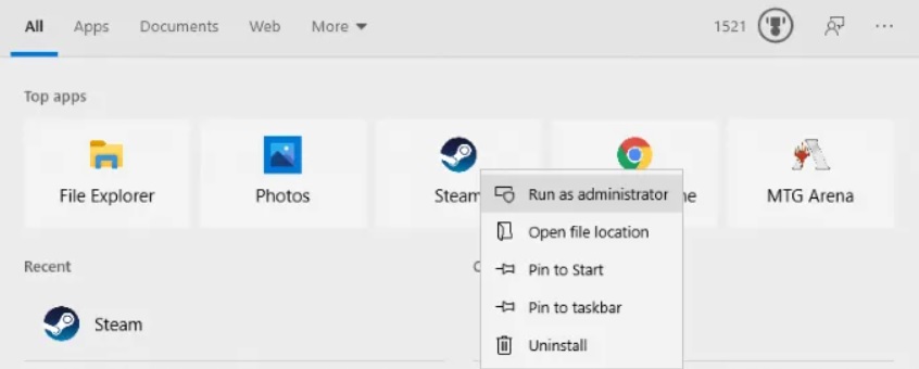 Başlat menünüzdeki Steam simgesini seçin ve sağ tıklayın. Ardından "Yönetici olarak çalıştır"ı seçin. Bu, Steam'in ön yüklenmesini durdurmaya çalışan tüm programları engelleyecektir. Her zaman işe yaramayabilecek basit bir yöntemdir, ancak denemeniz gereken ilk şeylerden biridir.