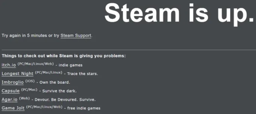 Başka bir düzeltmeyi denemeden önce denemeniz gereken ilk şey, Steam'in kapalı olup olmadığını bulmaktır. Servis çalışmıyorsa, başka hiçbir şey çalışmayacaktır. Web sitesinde "Steam Down" var mı? doğrulamak için ve web sitesi ayrıca Steam çalışmıyorsa eğlence için başka potansiyel çıkışlar öneriyor.