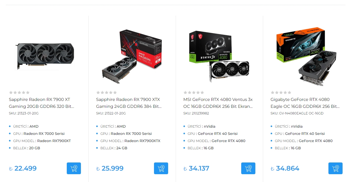 RX 7900 XTX'nin Türkiye fiyatlarına bakıtğımızda referans modelin 25.999 TL gibi bir fiyatla listelendiğini görüyoruz. Rakibi RTX 4080'in (16GB VRAM) fiyatları ise 35.000 TL'ye yakın olarak karşımıza çıkıyor. Yani aradaki fiyat farkı 10 bin TL'ye yakın.