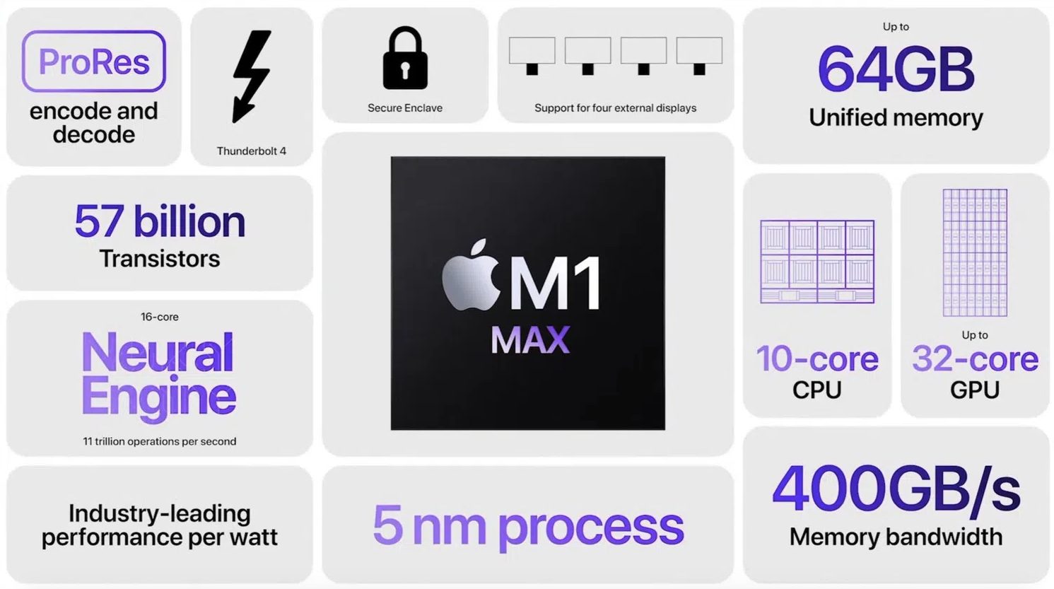 MacRumors’ta yer alan habere göre, Apple M1 Max, Intel’in 16-24 çekirdekli Xeon işlemciler tarafından desteklenen Mac Pro ve iMac’in performansının gerisinde kaldı. Apple'ın yeni M1 Max platformu 64 GB birleşik belleği destekliyor ve 400 GB/sn'ye kadar bellek bant genişliği sağlayabilmekte. Ayrıca 5nm çip 57 milyar transistör içeriyor ki bu da M1 Pro'dan %70 daha fazla. M1'den ise 3.5 kat daha fazla.