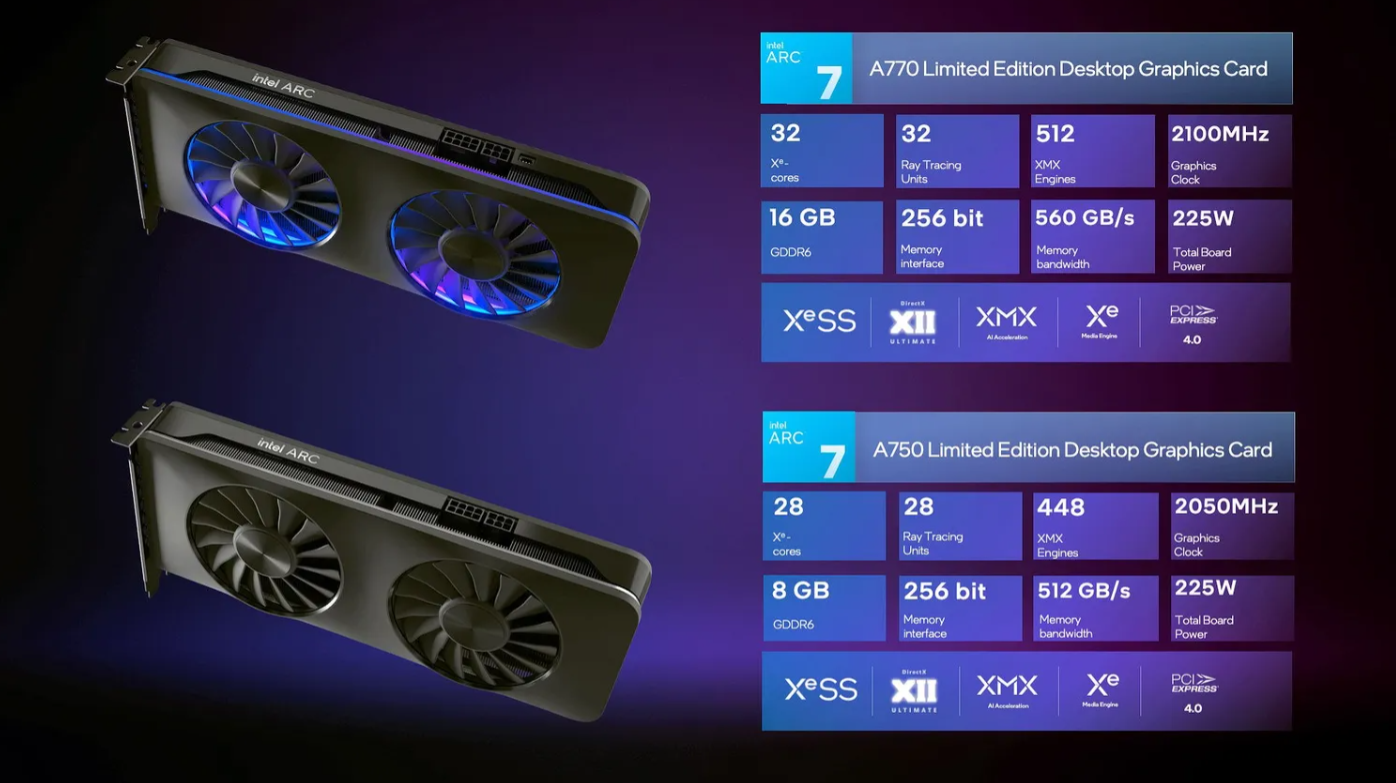Arc A750 ve Arc A770 ekran kartları serinin en tepedeki isimleri. Arc A750'de 8GB GDDR6 bellek, 28 adet Xe çekirdeği ve 2050 MHz saat hızı yer alıyor. Kağıt üzerindeki rakibi ise AMD Radeon RX 6600XT olarak gösterilebilir.