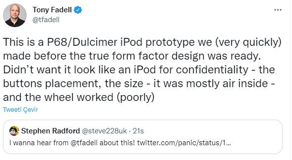 iPod’un mucidi Tony Fadell, bu paylaşımın üzerine iPod hakkında biraz daha ayrıntılı bir tweet atarak, bu sürümün P68/Dulcimer olarak adlandırıldığını ve son tasarımı gizlemek amacıyla bu prototipin tasarlandığını açıkladı.