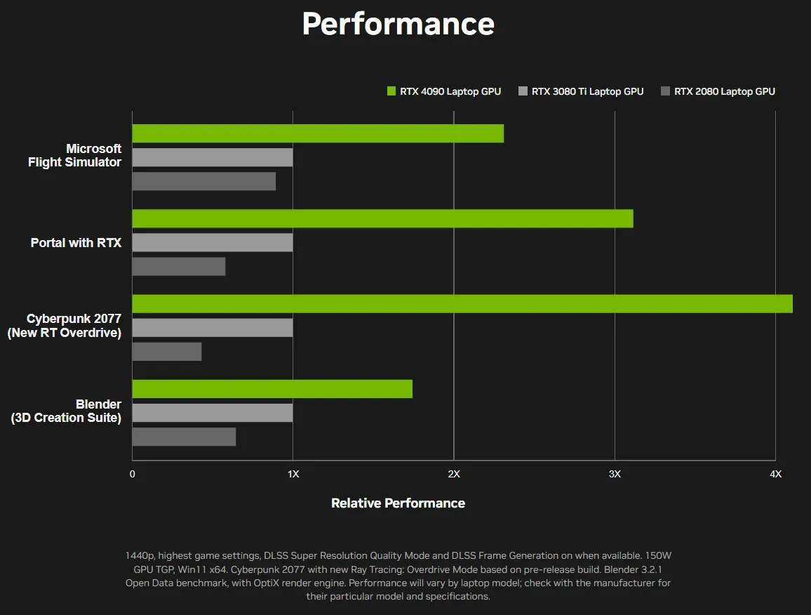 Nvidia, GeForce RTX 40 serisi dizüstü bilgisayar ekran kartlarını tanıttı. Nvidia'nın açıkladığı performans değerlerine baktığımızda adeta masaüstü performansının dizüstü bilgisayarlara geldiğini görüyoruz. Yeni dizüstü bilgisayar GPU'ları arasında RTX 4090, RTX 4080, RTX 4070, RTX 4060 ve RTX 4050 bulunuyor. İşte kartların detayları ve performans değerleri...