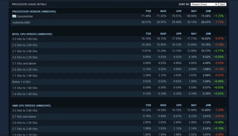%30'luk pazar payını geçtiği ve yükselişini sürdürdüğü açıklanmıştı. Haziran ayındaki Steam Donanım Anketi, Intel işlemcilerinin kullanım oranının
