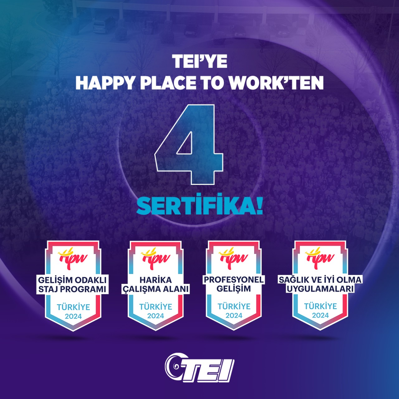 Daha önce Türkiye’nin En Mutlu İş Yeri seçilen TEI, çalışanları için geliştirdiği uygulamalar ve devreye aldığı yeni projeleriyle Happy Place to Work’ten farklı alanlarda 4 sertifika daha kazandı. Çalışanlarının kariyer gelişimlerini destekleyen uygulamaları, refahlarını geliştirme amacıyla devreye aldığı esenlik projeleri ve sunduğu çalışma ortamıyla TEI “Harika Çalışma Alanı” kategorisinde sertifikaya layık görüldü. Çalışanlarının kariyer hedefleri doğrultusunda farklı eğitim ve gelişim programları düzenleyerek, kişiselleştirilmiş programlar kurgulayan TEI, bu çalışmalarıyla da “Profesyonel Gelişim” alanında sertifika kazanmaya layık görüldü. Ayrıca, genç profesyonelleri iş hayatına kazandırma kapsamında “Kariyerini Uçur, Gücün Kaynağında Kariyer” gibi her dönem binlerce başvuru alan ödüllü birçok farklı yetenek kazanımı programıyla, TEI “Gelişim Odaklı Staj Programı” alanında sertifika kazandı.