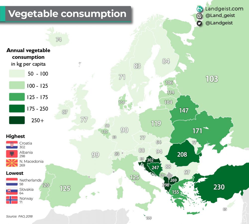 Çocukluğumuzda sebzeleri hiçbirimiz sevmezdik. Ancak zamanla sebzelerin çok sağlıklı olduklarını ve lezzetli sebzeleri pişirmenin yolları olduğunu çoğu yetişkin anlıyor. Bir insanın ihtiyaç duyduğu sebze miktarı yaşa ve cinsiyete göre değişiyor. Ancak yetişkin bir insanda ortalama günlük 240 gram ve yıllık 87, 6 kg'dır.Landgeist, yaptığı bir çalışma ile Avrupa ülkelerinin ortalama sebze tüketim oranlarını bir grafikte birleştirdi. Avrupa ülkelerinin yarısından biraz fazlasının yukarıdaki bahsettiğimiz değerleri karşıladığını görebiliyoruz. Kıbrıs, Çek Cumhuriyeti, Finlandiya, İzlanda, Moldova, Hollanda, Norveç, Slovakya ve İsveç, tüm Avrupa'da en az sebze tüketen ülkeler. Hollanda tüm Avrupa'da en az sebze tüketen ülke konumunda.