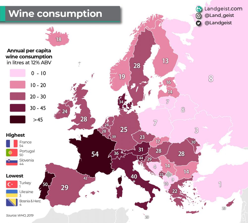 Avrupa'nın en büyük şarap tüketicisi konumunda, yıllık kişi başına 54 litre şarapla Fransa bulunuyor. Fransa'nın hemen arkasında 50 litre ile Portekiz var. Üçüncü sırada ise 44 litre ile Slovenya yer alıyor. Güney Avrupa'nın en büyük şarap tüketicisi olduğunu açıkça görülebiliyor.