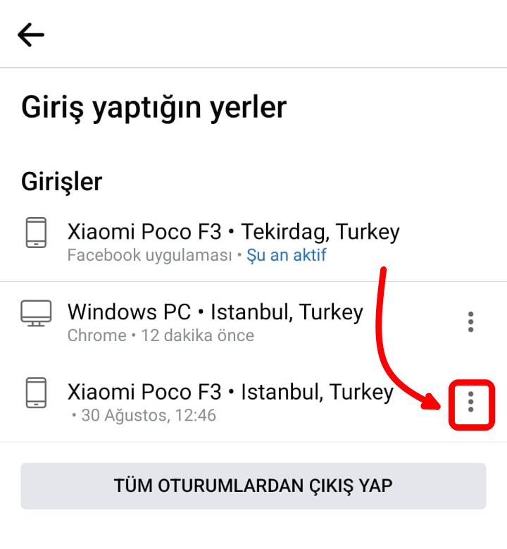 - “Giriş yaptığın yerler” bölümüne gelin ve anormal gözüken girişin sağ tarafında bulunan üç noktaya dokunun.