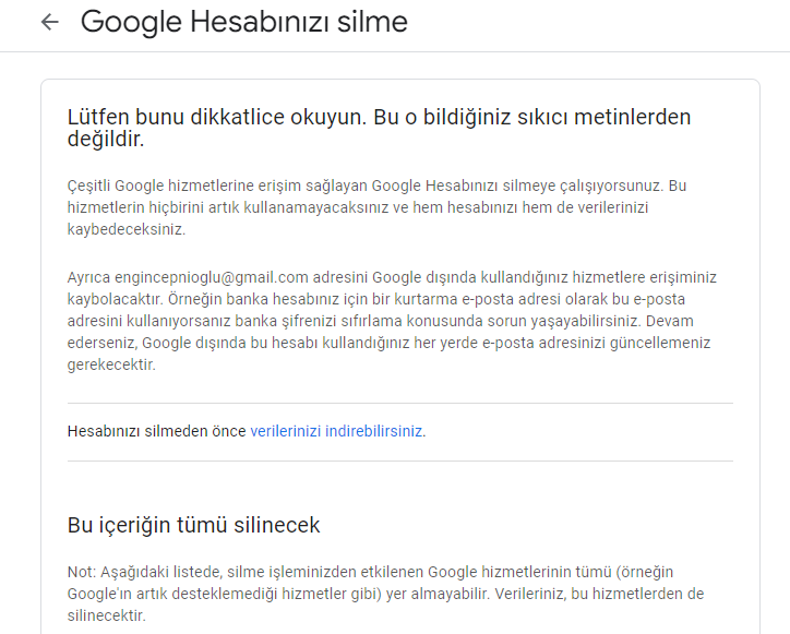Google hesabınız varsa internet üzerinden birçok hizmetten yararlanabilirsiniz. Peki, hesabınızı sildiniz. Neler kaybedersiniz bir bakalım. Başta birçok Google hizmetinden artık yararlanamazsınız. Hesabınızda depolanan bütün veriler bu işlem yüzünden silinecektir. Kişileriniz, fotoğraflarınız, dosyalarınız, takvimleriniz silme işlemi sonrası kaybolacaklardır. Ayrıca artık Google hesabınız var olmadığı için hiçbir cihaza giriş yapamayacaksınız. Bu durum cihazlar için gerekli uygulamaları indirmeyi engelleyebilir. Hesabınız ile satın aldığınız tüm abonelikler de kaybolacaktır. Bütün bunları tekrar elde etmek için tekrar hesap açmak zorunda kalabilirsiniz. Google hesabınızı silerseniz geri alamayabilirsiniz, bu yüzden silmeden önce gerekli verileri yedekleyiniz.