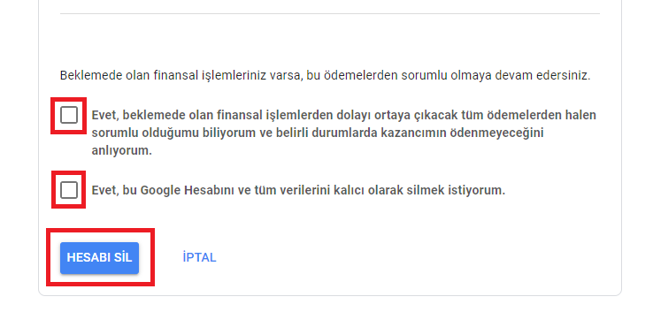 - Alt tarafta bulunan kutucukları işaretleyin ve son kararınız ise “Hesabı Sil” seçeneğine tıklayın.