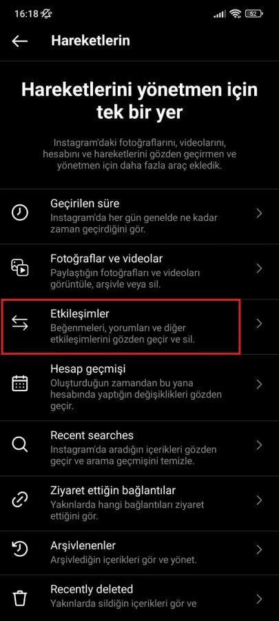Etkileşimler bölümünde uygulama, sizlere geçmişte yaptığınız eylemleri göstermektedir. Geçmişte yaptığınız yorumlar, beğendiğiniz gönderiler, hikayelere verdiğiniz yanıtlar ve değerlendirmeler bu bölümde görünmektedir. Etkileşimler bölümü sayesinde geçmiş hareketlerinizi görebilir ve düzenleyebilirsiniz.