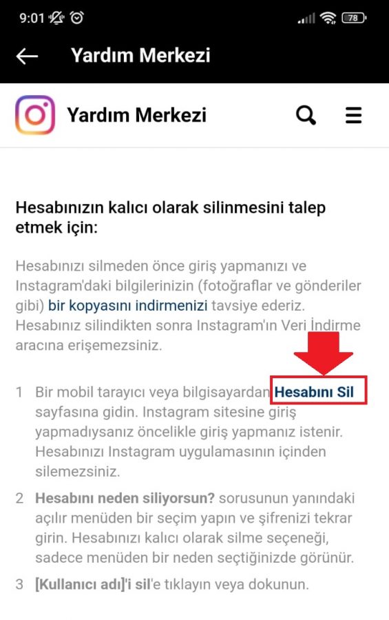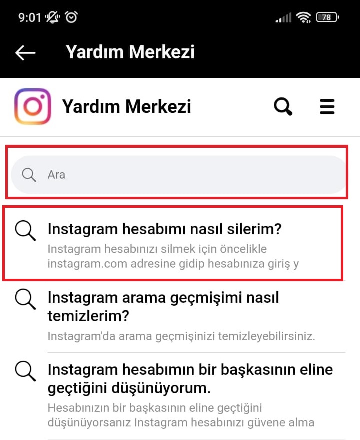 - Açılan sayfada arama yerine “Hesap silme” yazın ve aratın. “Instagram hesabımı nasıl silerim?” yazan bölüme tıklayın.