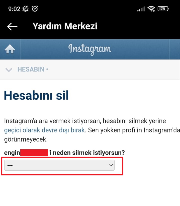 - Hesabınızı silme adımları ile benzer şekilde ilerleyin ve “Hesabını Sil” sayfasına kadar devam edin.