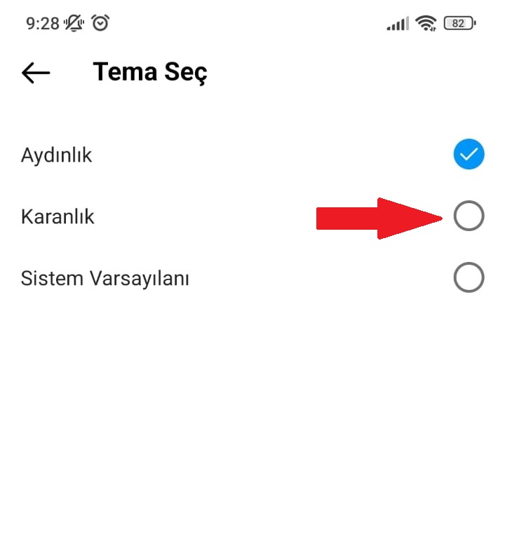 - Koyu Mod’u açmak için Koyu’yu seçin.