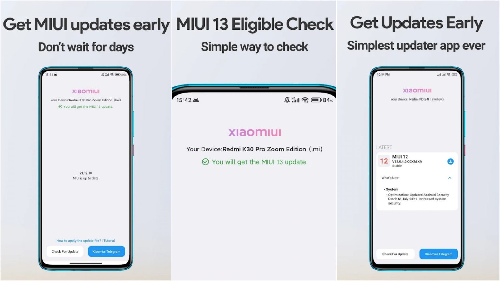 Xiaomiui grubu tarafından geliştirilen ve Google Play Store'dan indirilebilen MIUI updater, telefonunuza yeni yazılım güncellemesi gelip gelmeyeceğini gösteriyor. Xiaomi, Redmi ve POCO marka telefon kullanıcıları bu uygulamayı telefonuna indirerek MIUI 13 güncellemesi alıp almayacağını öğrenebilir. MIUI Updater'ı kullanmak için: