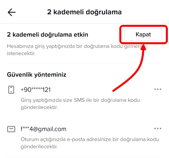 • “2 kademeli doğrulama etkin” bölümünün sağ tarafında bulunan “Kapat” seçeneğine dokunun.