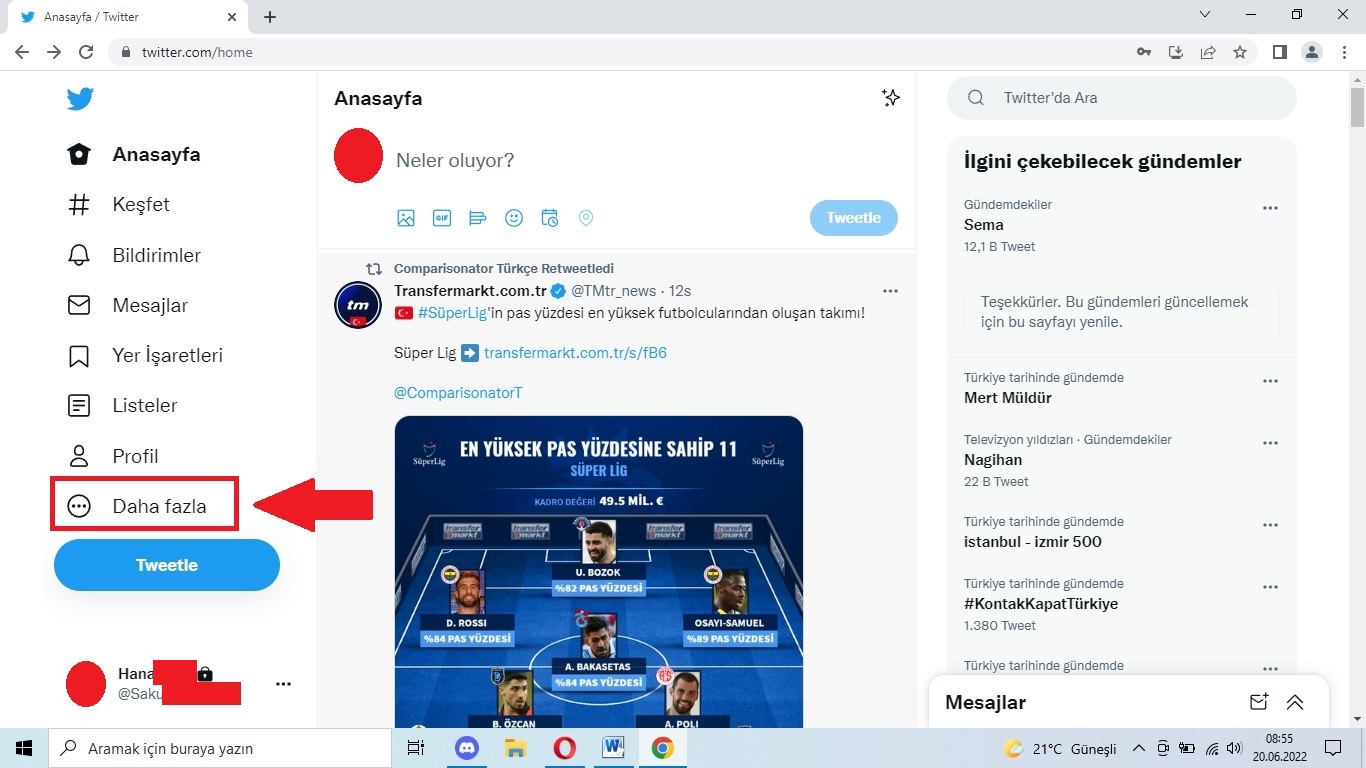 - Bilgisayarınızdan Twitter hesabınıza giriş yapın ve ana sayfanın solunda bulunan “Daha fazla” seçeneğine tıklayın.
