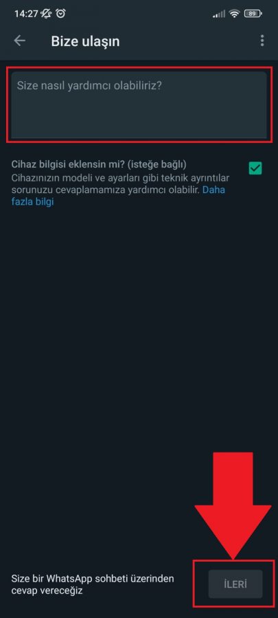 - “Size nasıl yardımcı olabiliriz?” kısmına banınızı kaldırma talebini düzgün ve anlaşılır bir dille yazın ve “İleri”ye dokunun.