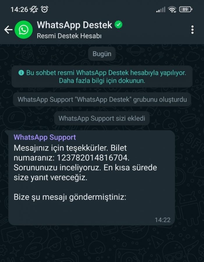 - Mesajınız WhatsApp destek bölümüne iletilecektir. Size bir bilet numarası mesaj ile gelecek ve en kısa sürede cevap vereceklerdir.