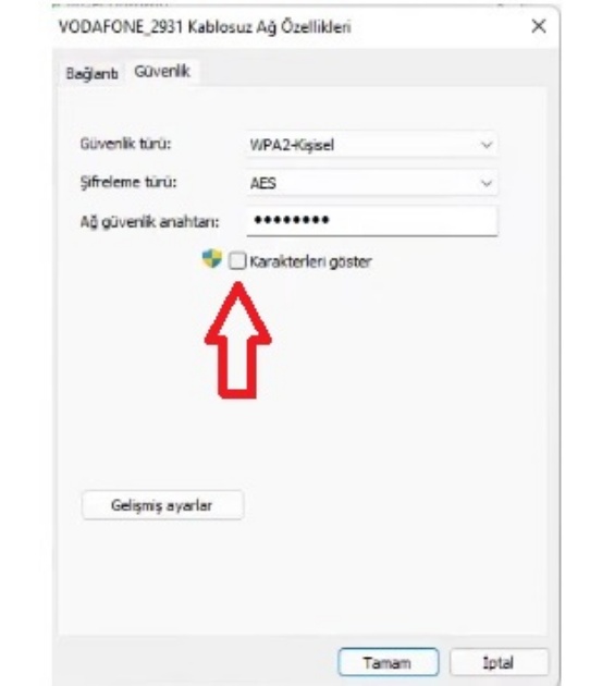 - Ağ güvenlik anahtarı bölümünde bulunan “Karakterleri göster” seçeneğine tıklayarak Wi-Fi şifrenizi öğrenebilirsiniz.