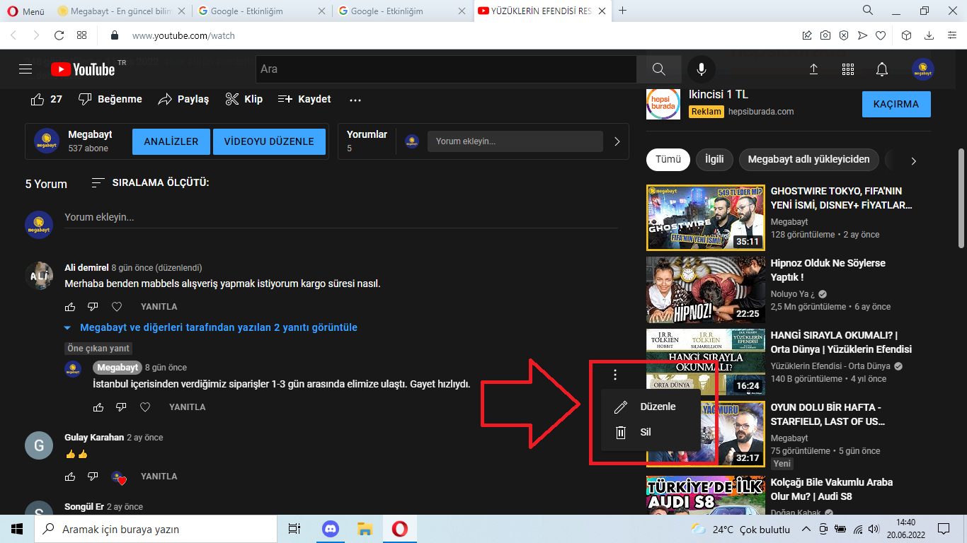- Yorumlar kısmına geldiğinizde, yaptığınız yorum öne çıkan yanıt olarak kaşınıza çıkacaktır. Yaptığınız yorumun yanında bulunan üç noktaya tıklayarak, yorumunuzu silebilir veya düzenleyebilirsiniz.