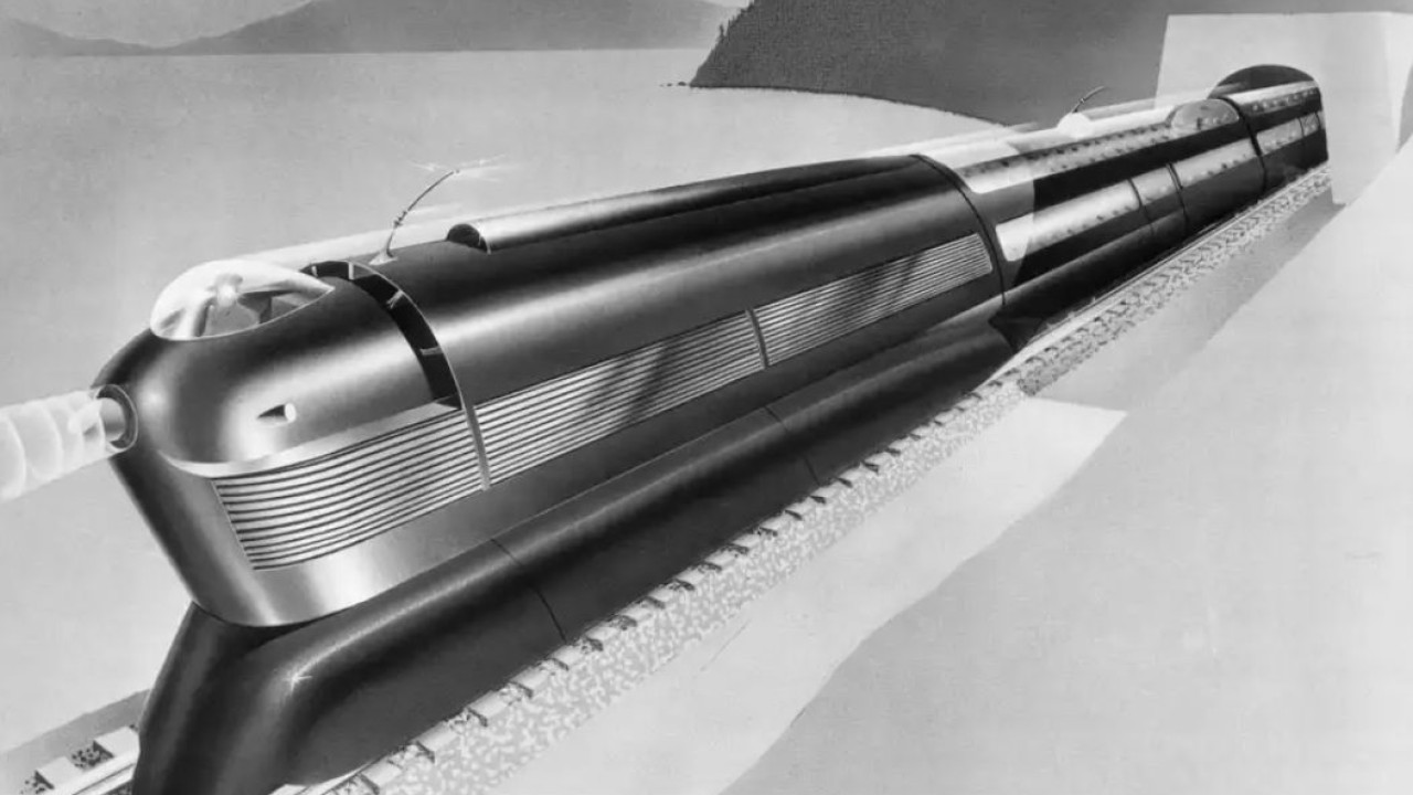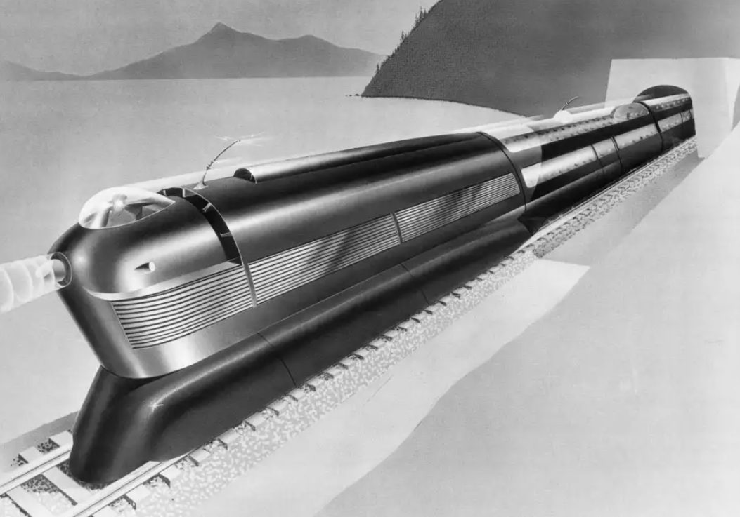 1975'teki modern tren , Amerikan Demiryolları Birliği'nin yardımıyla üretilen 1955'ten bu resimde hayal edilen biçimde oldukça iyi bir görünüm sağladı . Trenler, "günümüzün arabalarından daha hafif ağırlık ve daha düşük ağırlık merkezi ve ayrıca çok daha yüksek hızlarda virajları geçme yeteneği ile karakterize edildi." deniyordu.Streamliner ne demek diye sorarsanız: Streamline, aerodinamik olarak daha az hava direnci sağlayacak yönde yapılan tasarım şeklidir. 1930'larda ortaya çıkan bu akım, su damlasından yola çıkmış, önce uçaklarda ve denizaltılarda kullanılmış ve bunu otomobiller ile trenler izlemiştir.