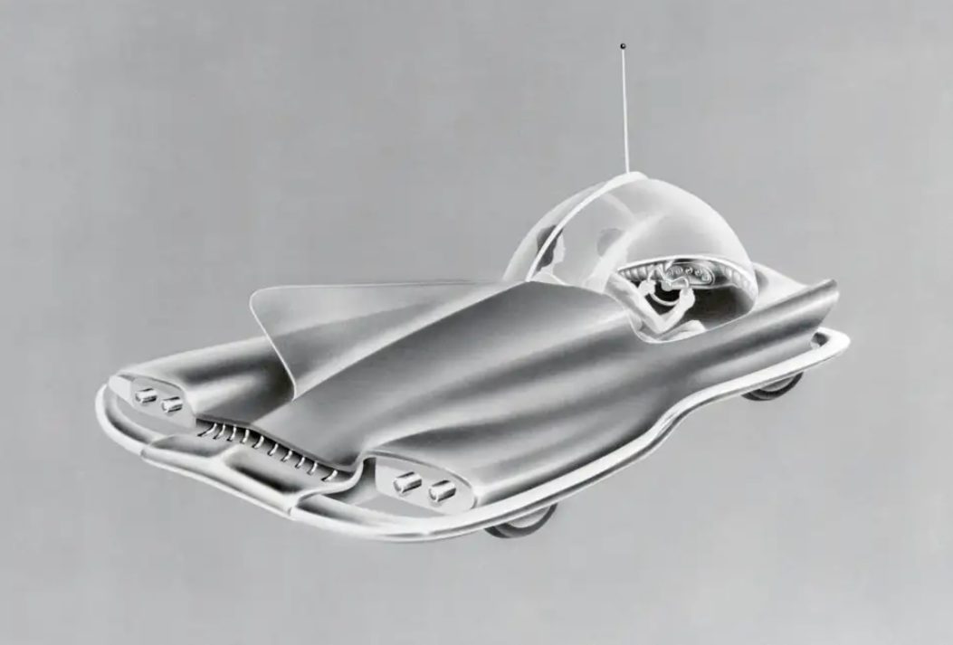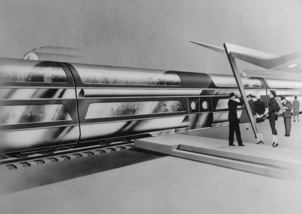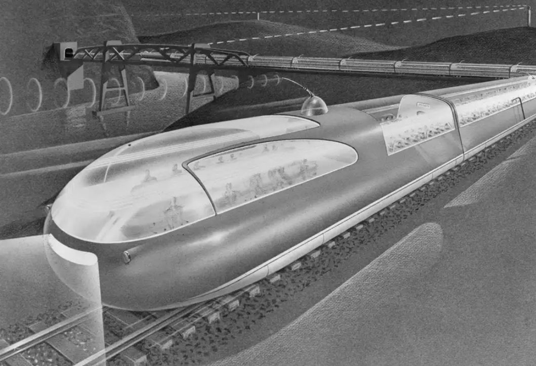 1955'teki ABD Ticaret Odası slayt sunumunda hayal edilen 1975 tarihli bu çift katlı banliyö treni, 1930'larda ilk kez popüler hale gelen modern görünümü içeriyordu.