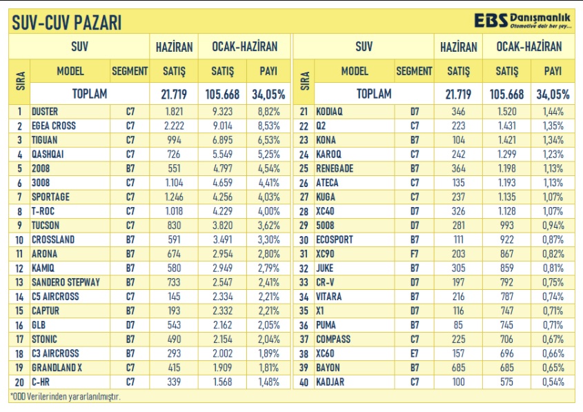 Mali Müşavir Erol Şahin, 2021 yılının ilk yarısı boyunca Türkiye'de en çok satılan otomobil türünün hangisi olduğuna dair bir istatistik paylaştı.Paylaşılan istatistiğe göre Türkiye'nin 2021 yılında en çok satın alınan araç türü SUV tipi otomobil oldu. Hatta sadece Haziran ayında tam sayı olarak 21.719 adet SUV-CUV tipi otomobil satılmış. İlk 6 ayda ise toplam SUV tipi araçlar 105.668 adet satış yaparak pazardan yüzde 34 pay aldı.