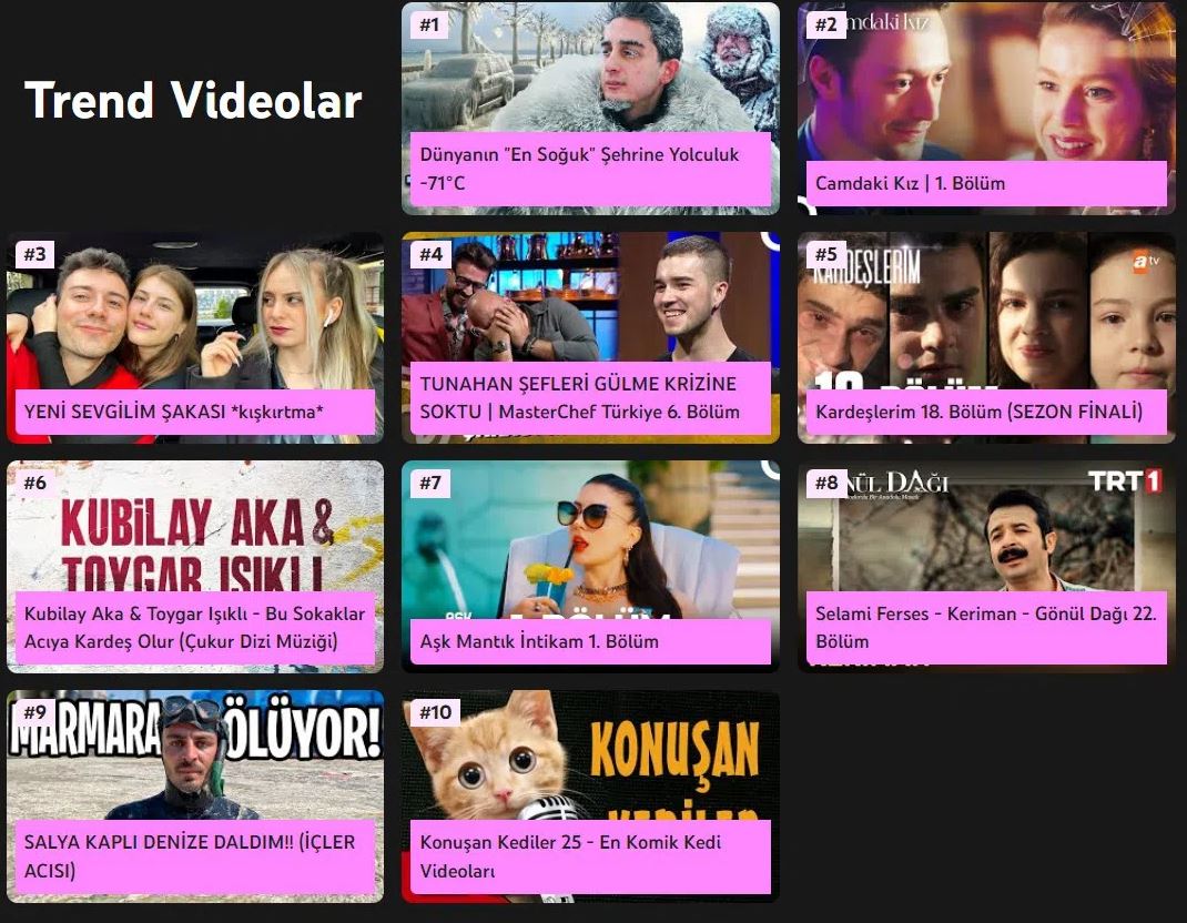 Türkiye'de yılın en popüler trend videosu ilginç videolarıyla tanından Ruhi Çenet'in "“Dünyanın en soğuk şehrine yolculuk -71c” videosu oldu. Belgesel tarzında bir içerik olan bu video listedeki diğer içeriklerden bu yönüyle ayrılıyor. Listenin devamı iste YouTube Türkiye'nin tahmin edilebilir içeriklerinden oluşuyor. İkinci sırada Camdaki Kız dizisinin ilk bölümü var. Üçüncü sırada YouTube'un tartışmalı içerik türlerinden olan bir 'kışkırtma' videosu var. Enes Batur'un hazırladığı bu kışkırtma videosunun adı ise “Yeni Sevgilim şakası *kışkırtma". Listenin en tatlı kısmı ise 10. sırada yer alan komik kedi videosu oldu.