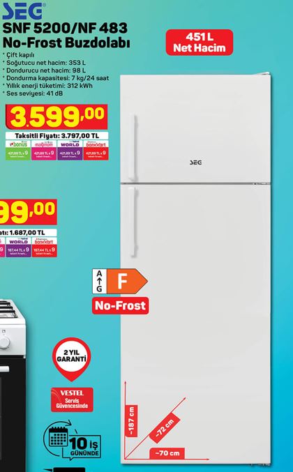 SEG SNF 5200/NF 483 No-Frost Buzdolabı- 451 L toplam net hacim- Çift kapılı- Soğutucu hacmi: 353 L- Dondurucu hacmi: 98 L- Dondurma kapasitesi: 7 kb/24 saat- Yıllık enerji tüketimi: 312 kWh- Ses seviyesi: 41 dB